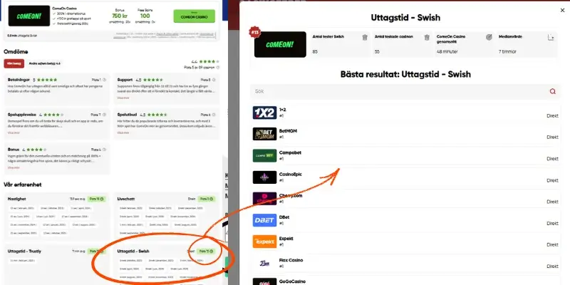 Du kan jämföra casinots testresultat och betyg genom att klicka på frågetecknet i sektionerna ”Omdöme” och ”Vår erfarenhet”.