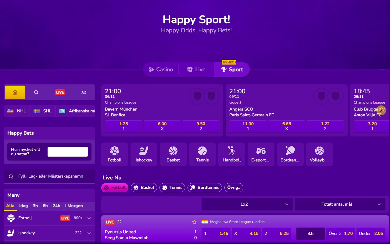 Totalt listar Happys nya sportavdelning 32 sporter med allt från fotboll, hockey och tennis till mer nischade alternativ. Du kan spela på allt från Kabaddi och Squash till Snooker, Golf och Lacrosse för att dra några exempel. I utbudet hittas alla de stora ligorna i olika sporter inklusive Allsvenskan, SHL, Premier League och NBA.