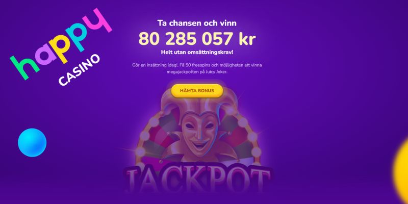 Vad exakt består erbjudandet av då? I utbyte mot att du reggar dig på Happy Casino och sätter in åtminstone 100 kr får du 50 free spins utan omsättningskrav. Gratissnurren är värda 2 kr styck och gäller i jackpotten Juicy Joker Mega Moolah från Games Global.