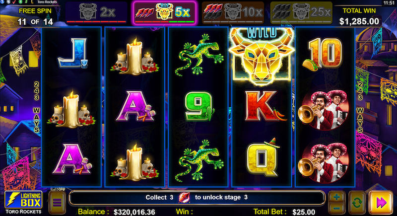 Den alltid lika intressanta utvecklaren Lightning Box har i juni i år släppt ytterligare en ny och underhållande slot. I denna slot är det fest och maskerad som är temat, och bäst av allt i spelet är de sprakande raketerna som förgyller alla dina vinster i spelet - samt wild tjuren som under bonusspelet kan ge en vinst om hela 25 gånger din insats. Vi ska nu kika på vad Toro Rockets mer har att bjuda på.