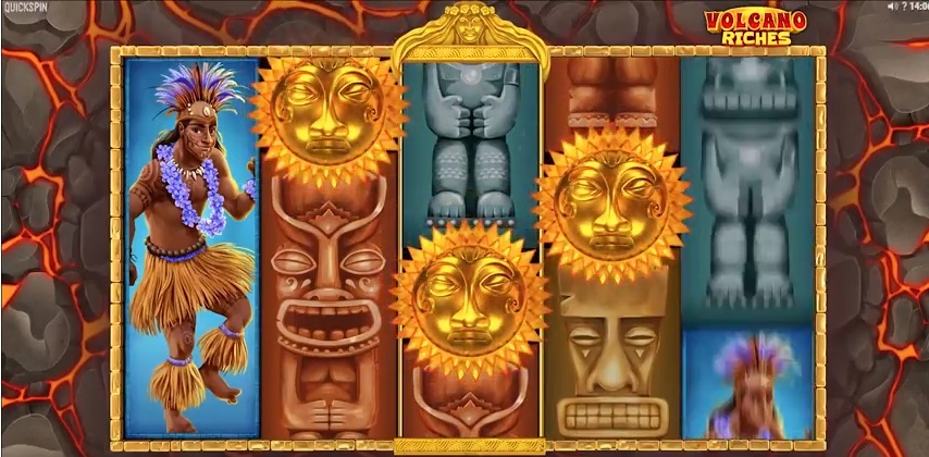 Temat i Volcano Riches bygger på den polynesiska kulturen, så du kommer få se allt från gräskjolar till urholkade kanoter och uthuggna monolitiska figurer. Temat bygger på ett område som finns på riktigt och även om det är animerat så har Quickspin gjort allt för att göra det så verklighetstroget som möjligt.