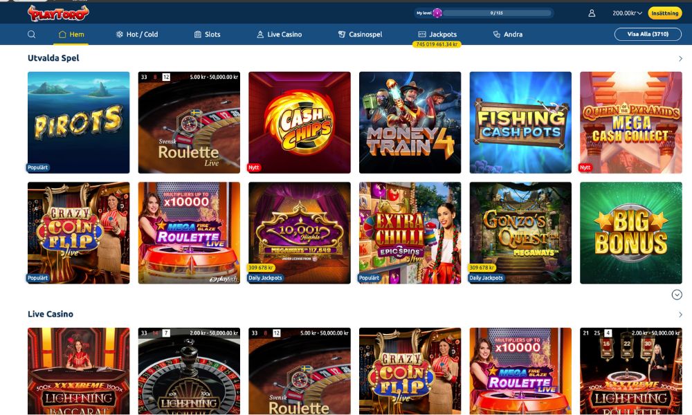 PlayToro är ett renodlat casino, och här hittar du olika typer av slots och bordsspel. Alla bordsspelen finns i live casinot, och det finns inga datoriserade versioner.