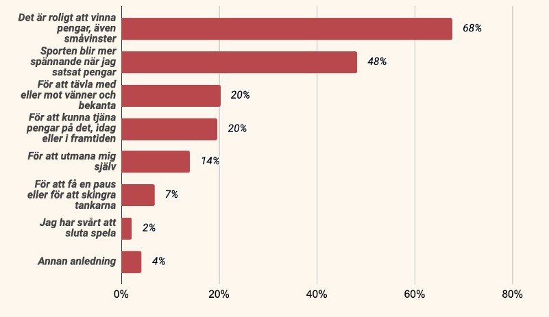 Kommentar: På frågan varför man man spelar på betting, svarade 68% att det främst är för att vinna pengar. På en andra plats med 48% kom skälet att sporten blir mer spännande när man hade satsat pengar.