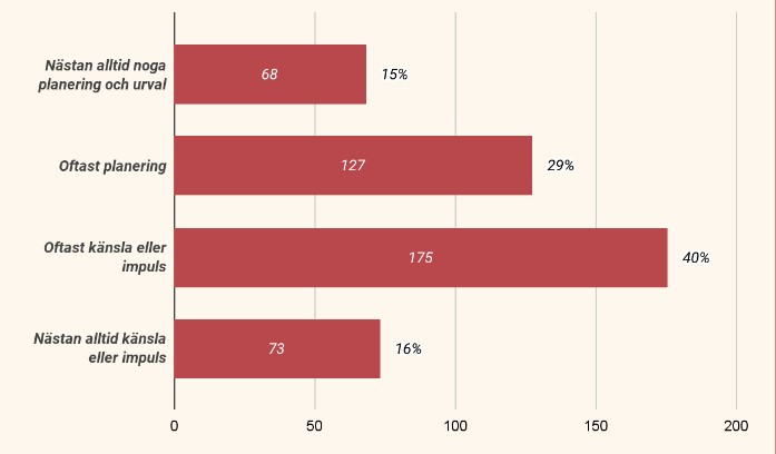 Kommentar: De flesta i undersökningen uppgav att de oftast går på känsla eller impuls. 29% uppgav att de ofta planerar vad de ska spela på.