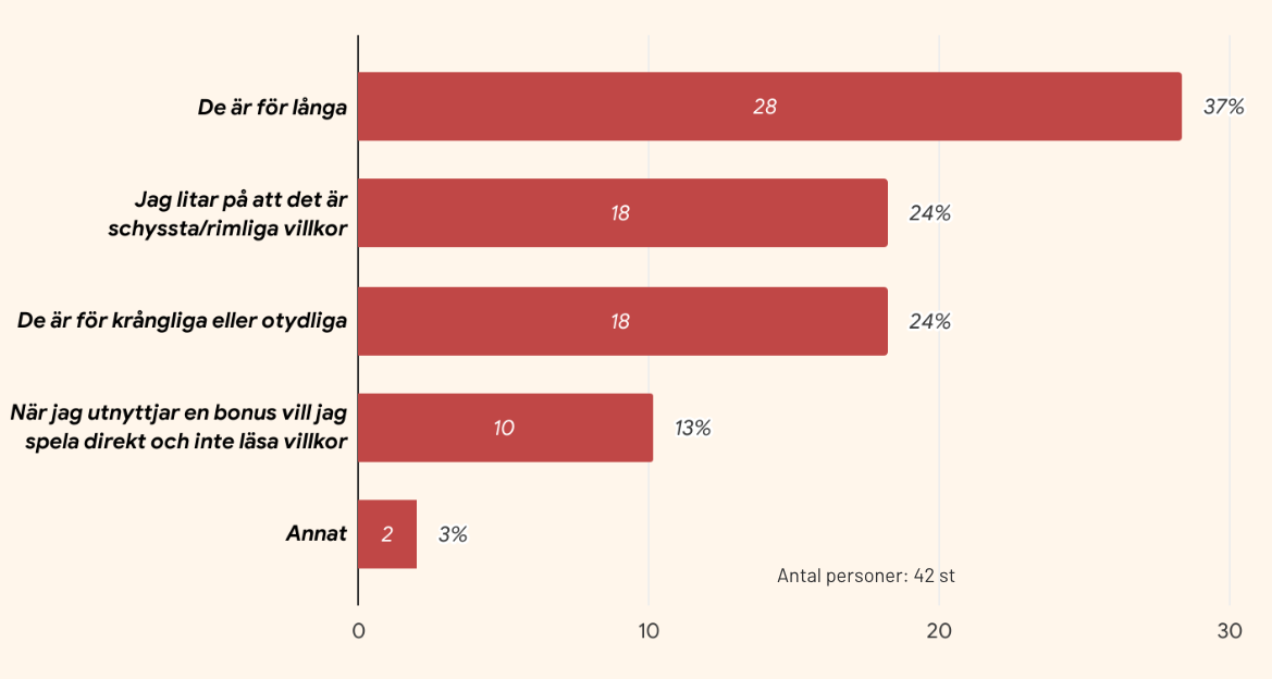 Den vanligaste anledningen till att inte läsa bonusvillkor är alltså att de är för långa. Totalt är det över 60 % som inte läser bonusvillkoren på grund av att de är för långa eller för krångliga/otydliga.