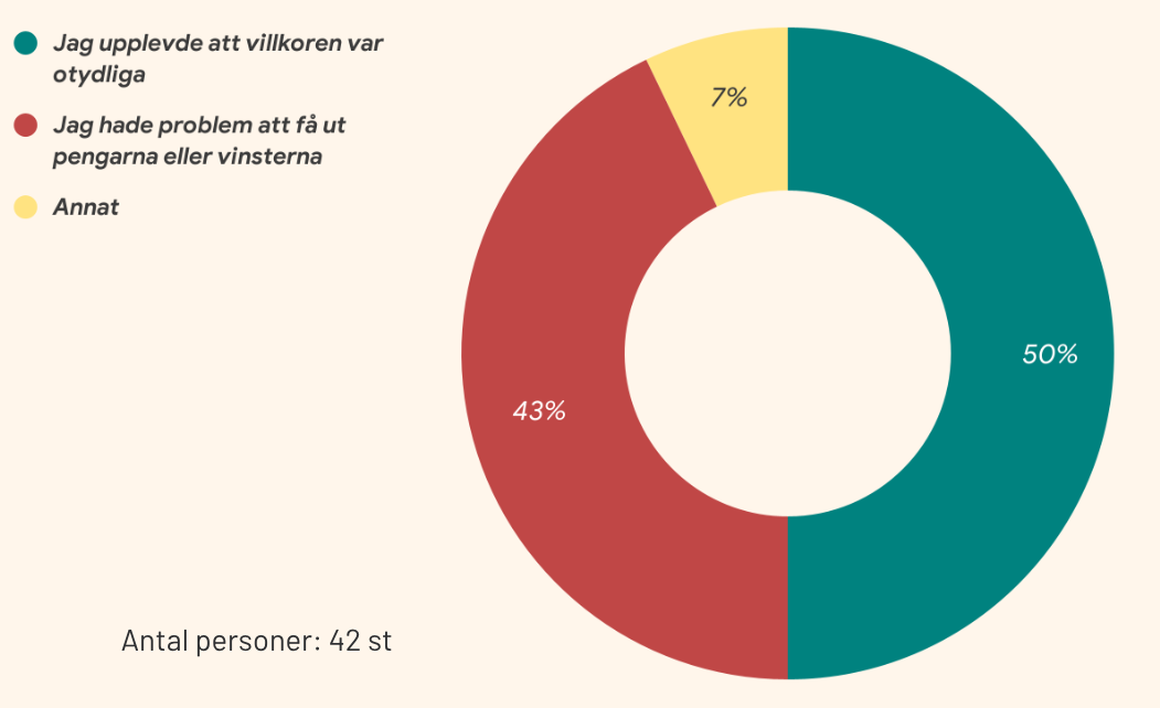 Det flest personer angav var problemet var att villkoren kändes otydliga. Något som såklart kan höra ihop med det andra svaret, att spelaren hade problem med att få ut pengarna eller vinsterna.