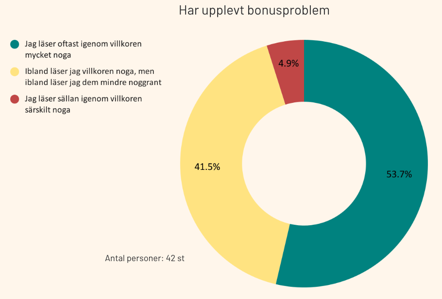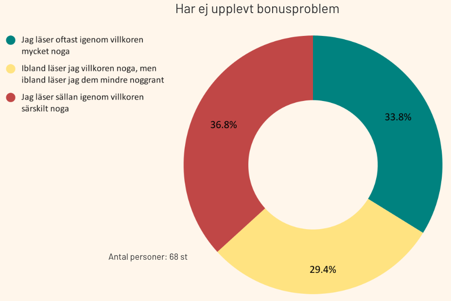 Eftersom vi inte har någon djupare information än det här så blir vår tolkning förstås endast gissningar. Men då många upplevde att problemet med bonusar var att villkoren var otydliga, kan det vara så att de som inte läst villkoren noggrannt inte heller upplever dem otydliga – just för att de inte har läst dem!