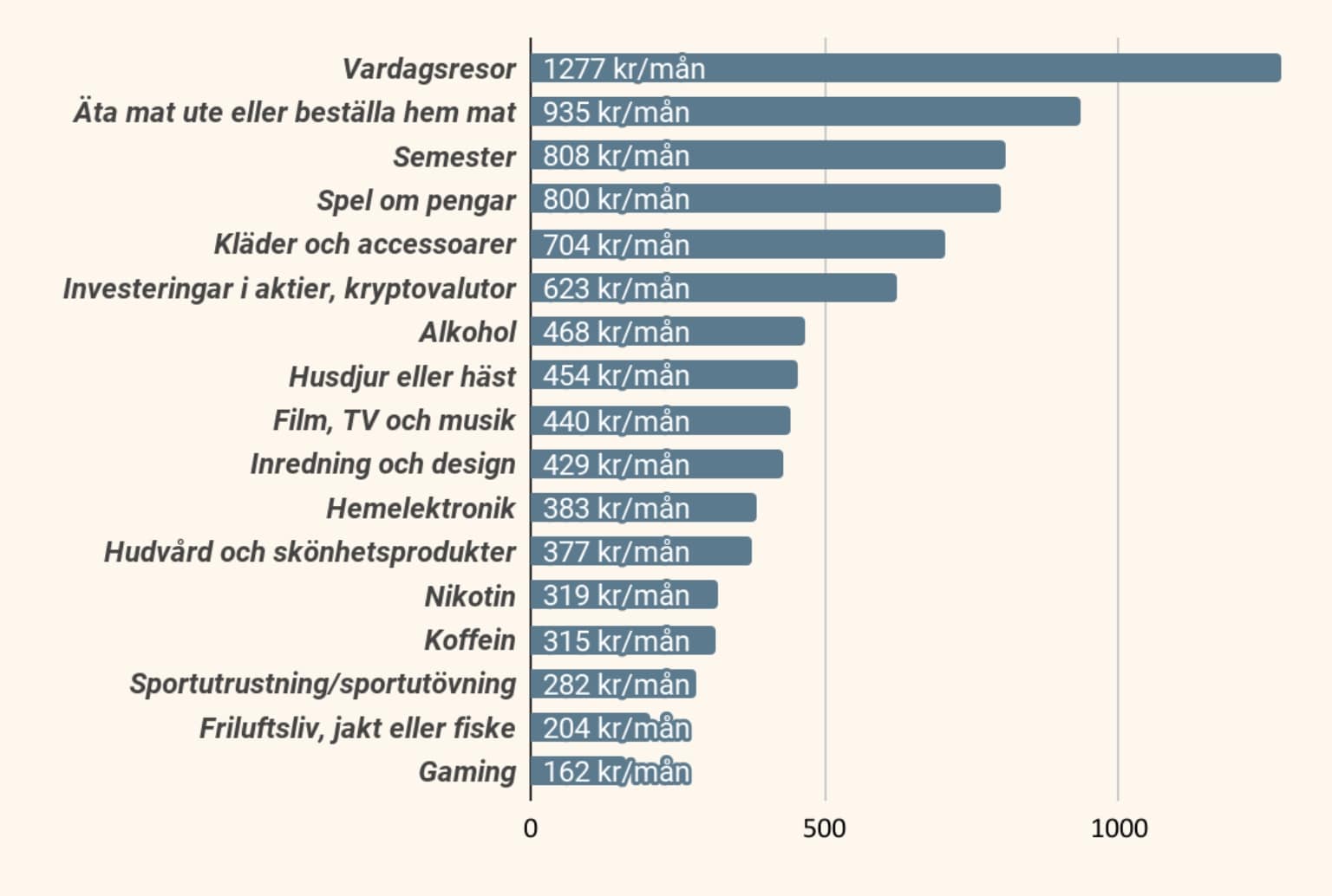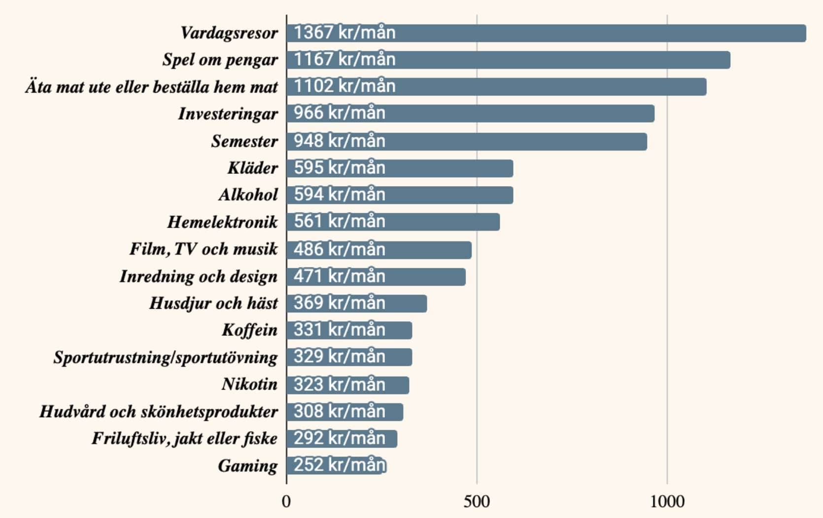Vi valde att utesluta kategorier för en del löpande utgifter som inte går att påverka i lika stor utsträckning, så som kostnader kopplade till boende, mat, försäkringar, barnomsorgsavgifter och liknande. Vi ville främst titta på utgifter som på något sätt är kopplade till nöjen.