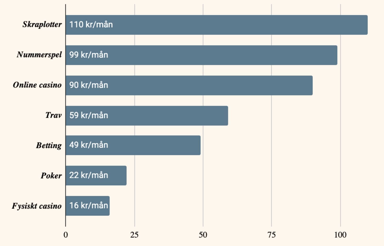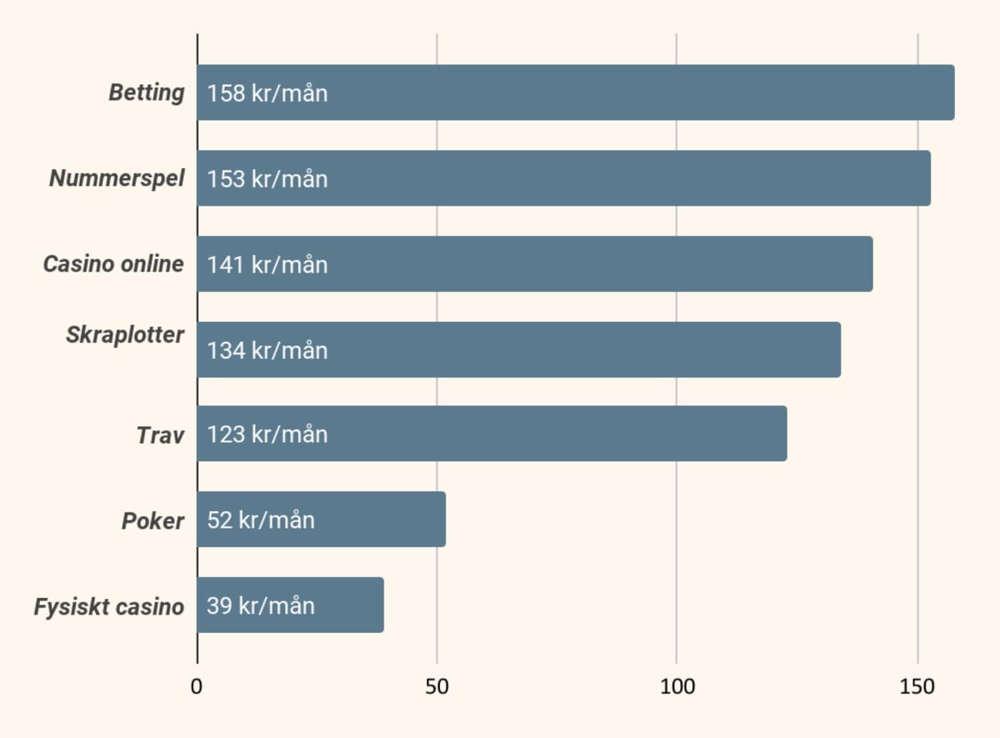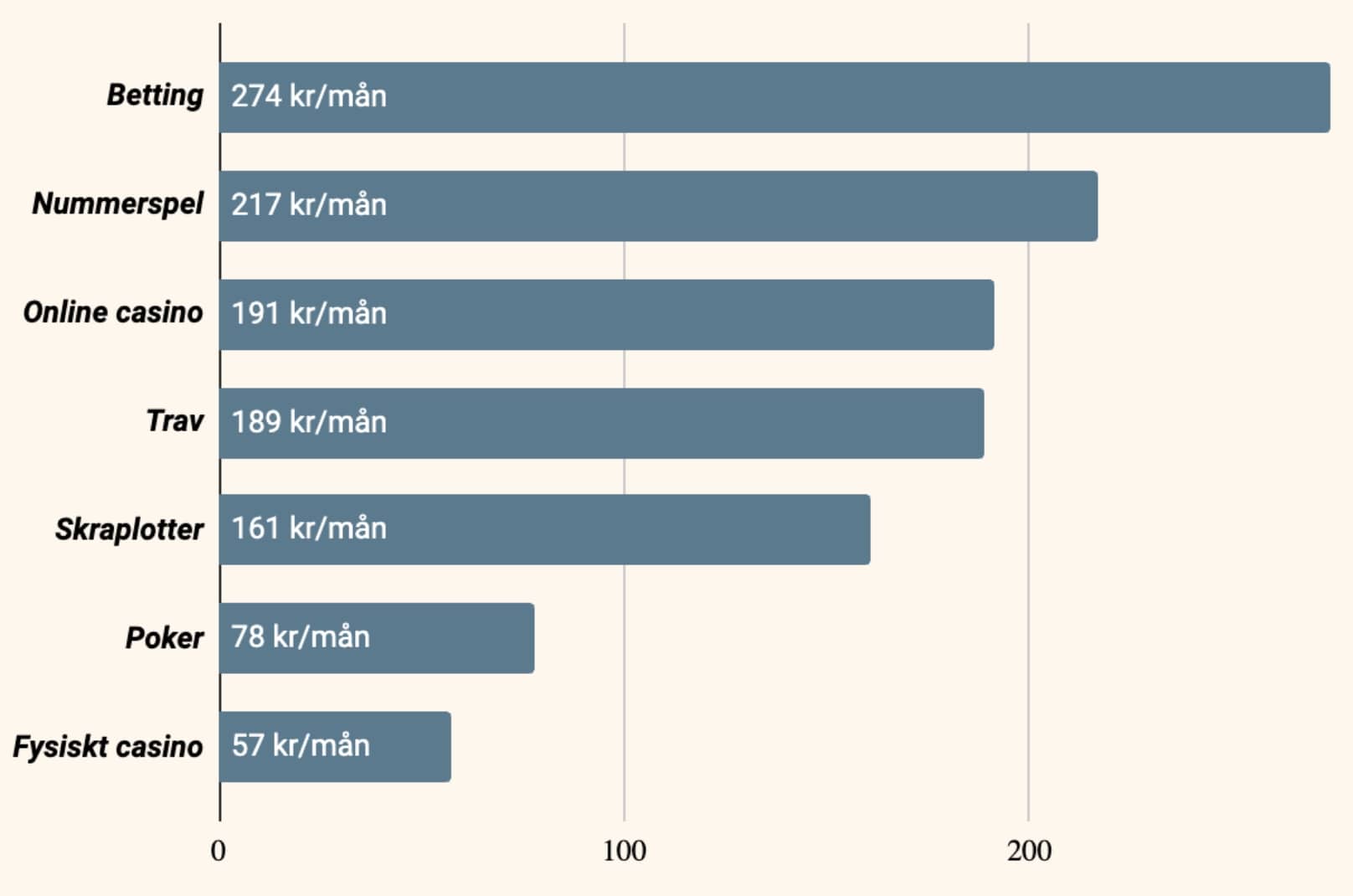 Enligt statistik från Spelinspektionen så ligger den siffran på 275 kronor i månaden för hela befolkningen. Och när de har tittat endast på den delen av befolkningen som spelar ligger summan på strax under 500 kronor i månaden.