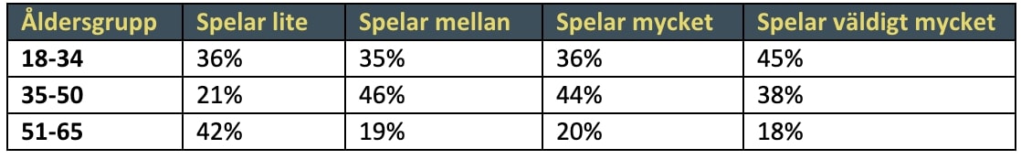 Den slutsatsen drar vi från att de som spelar väldigt mycket var också de som i störst utsträckning