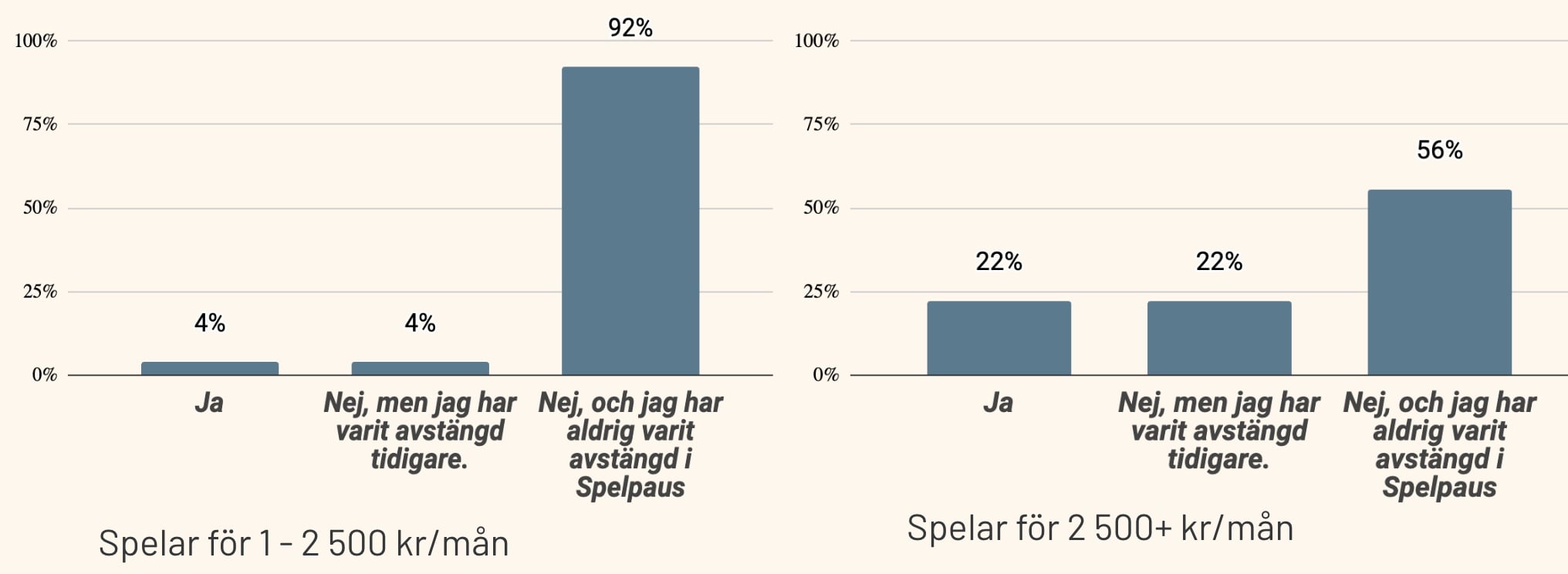 Det är alltså 22% av de som spelar för mer än 2 500 kronor i månaden som är registrerade hos Spelpaus, vilket innebär att de spelar på casinon utan svensk licens.