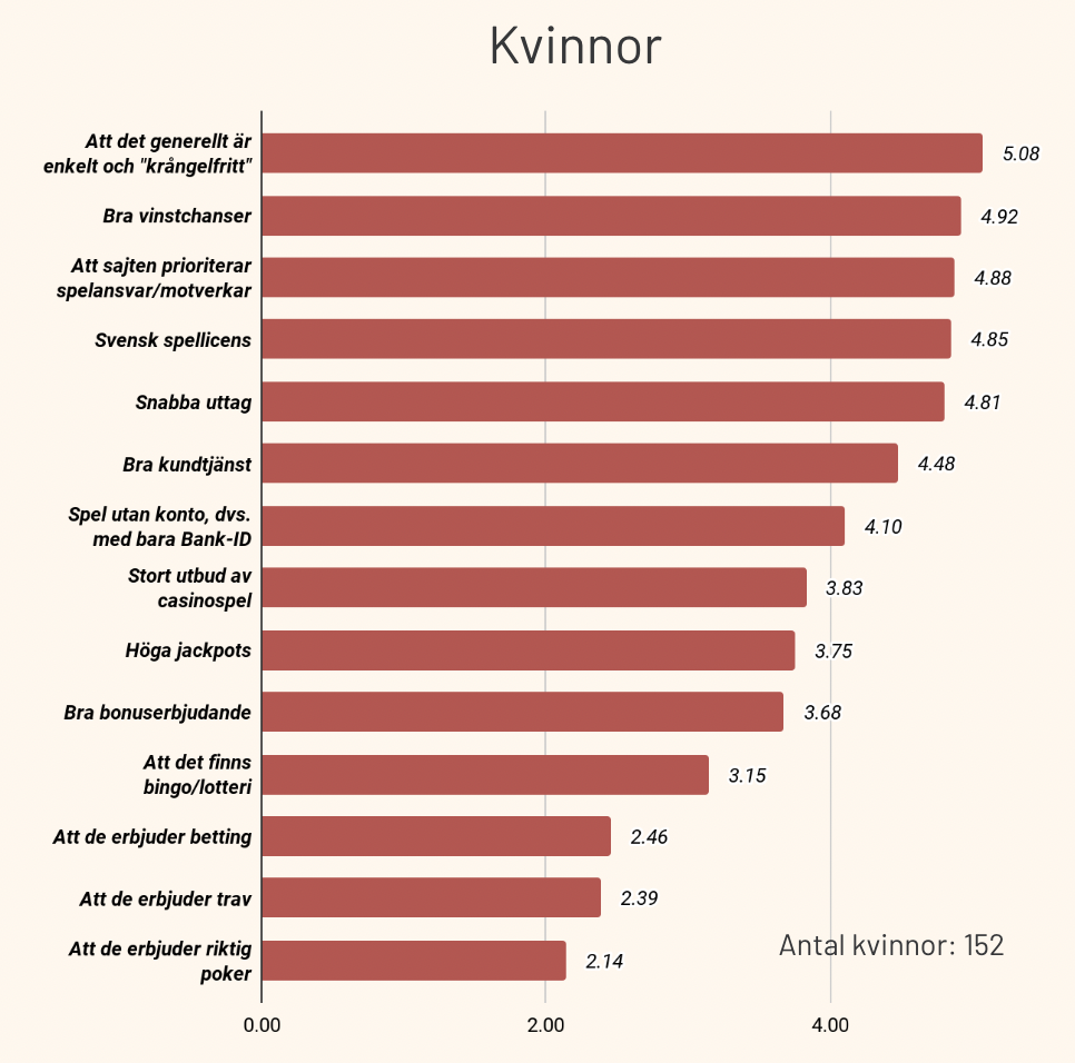 Vi kunde se att kvinnor rankade enkelt spelande samt säkerhetsfunktioner något högre upp än vad männen gjorde. Men vi såg också att de prioriterade bra vinstchanser högre, medan männen prioriterade snabba uttag.