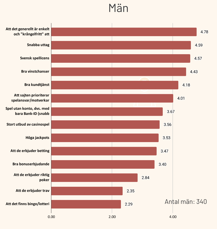 Svaren hos männen däremot kunde vi se mer följde samma mönster som det totala svaret. Däremot såg vi en intressant skillnad hos männen när vi kollade på svaren i de olika åldersgrupperna. Män i åldern 50 – 75 år rankade svensk spellicens som den viktigaste faktorn när de valde sajt att spela på.