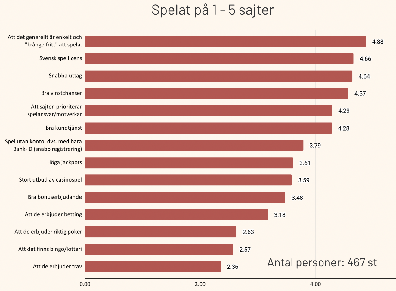 Exempelvis kom faktorn ”Att sajten prioriterar spelansvar och motverkar spelberoende” inte ens med på topp fem bland de som hade spelat på två eller fler sajter.
