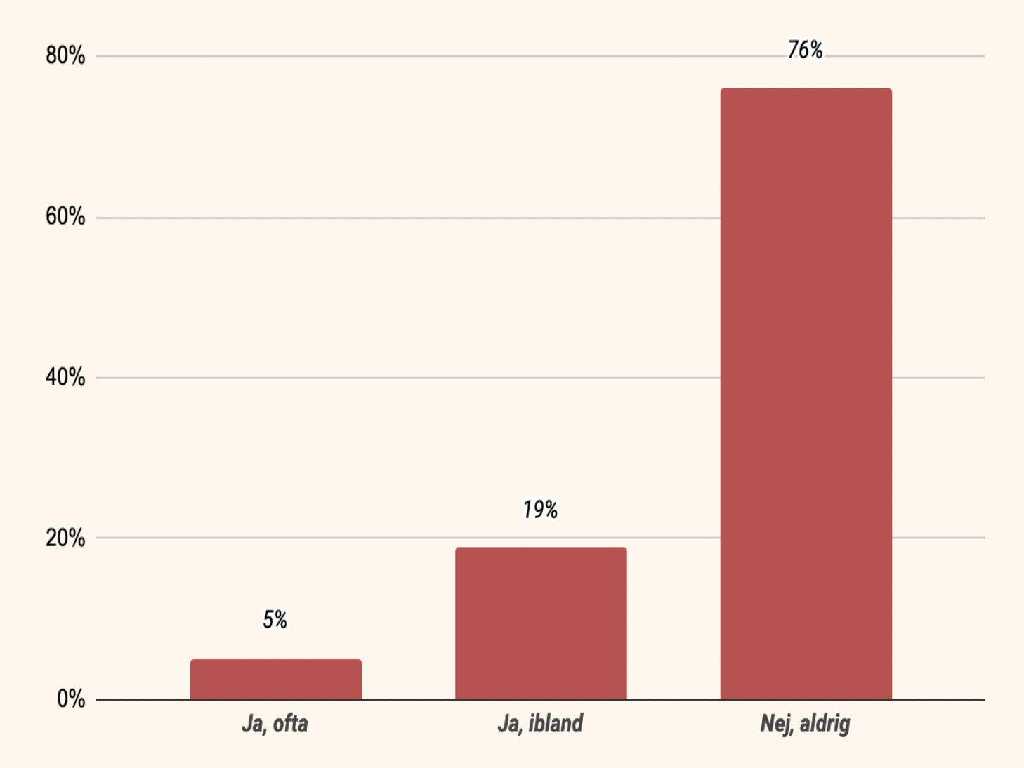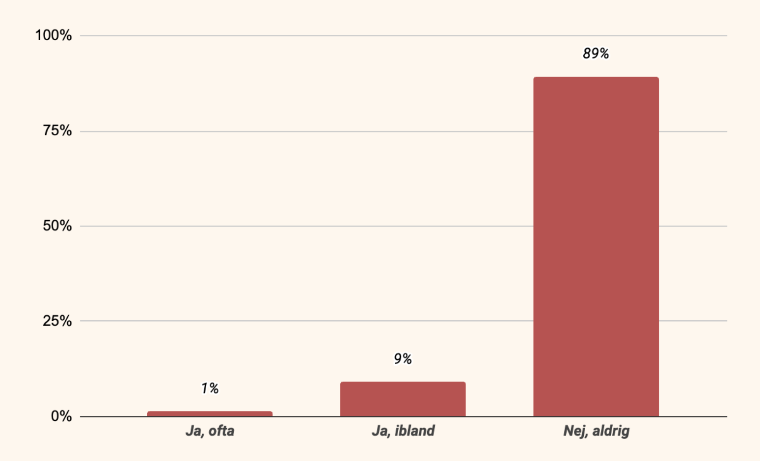 Frågan vi ställde till respondenterna var: Händer det att du spelar nätcasino/betting online på arbetstid? (Ej obetald lunchrast)