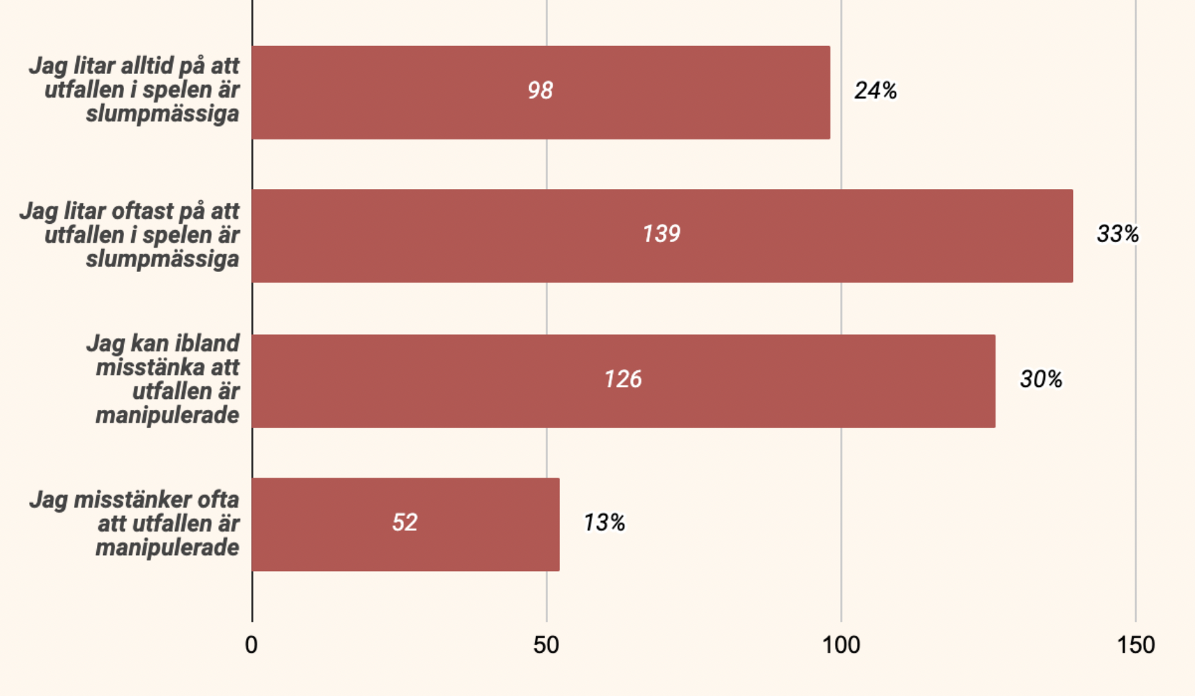 | Spelfrekvens | Misstänker ibland att utfallet är manipulerat | Misstänker ofta att utfallet är manipulerat | Litar oftast på att utfallen är slumpmässiga | Litar alltid på att utfallen är slumpmässiga |