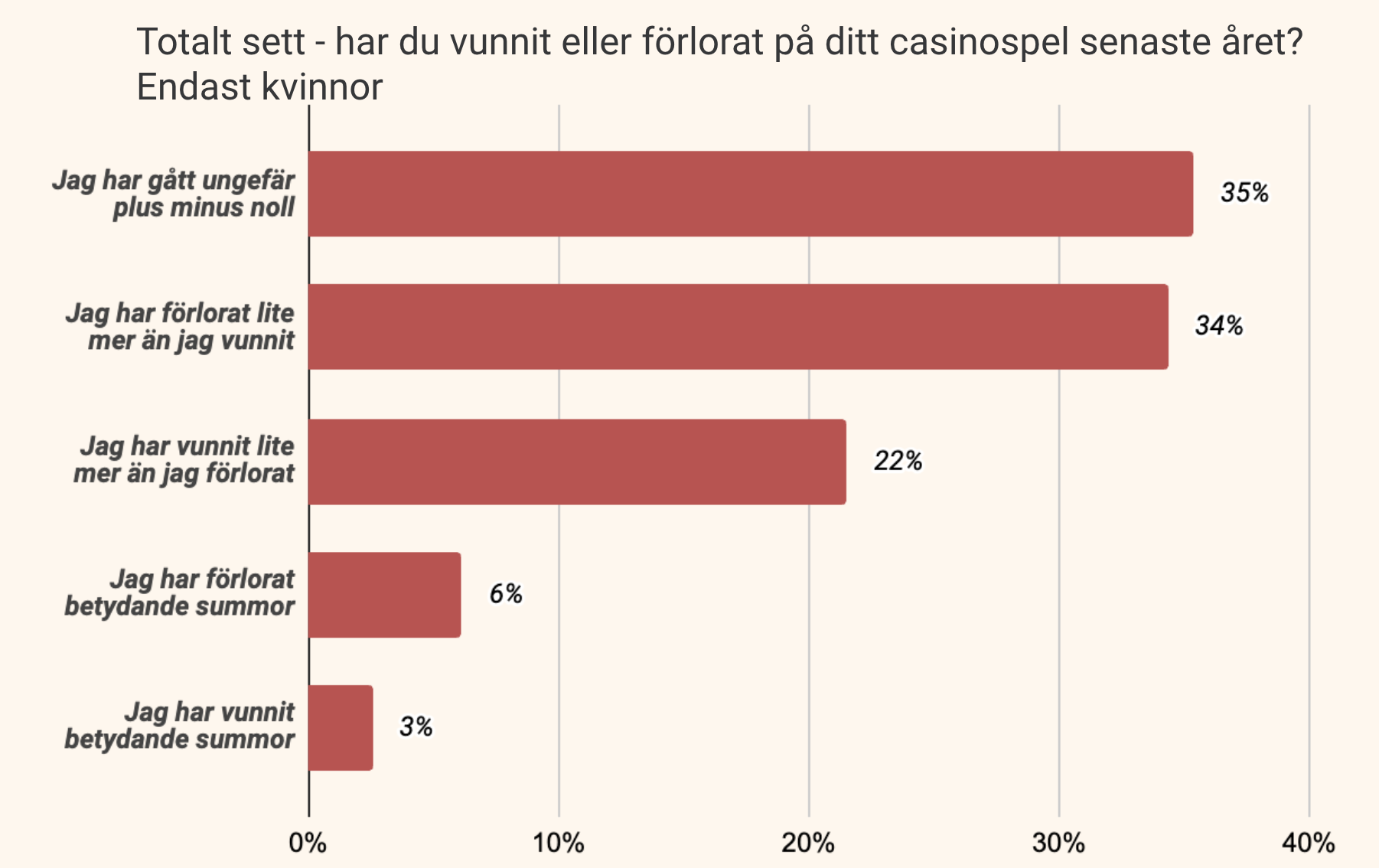 Tittade vi däremot endast på de kvinnliga casinospelarna såg det annorlunda ut. Då angav störst andel att de hade gått ungefär plus minus noll.