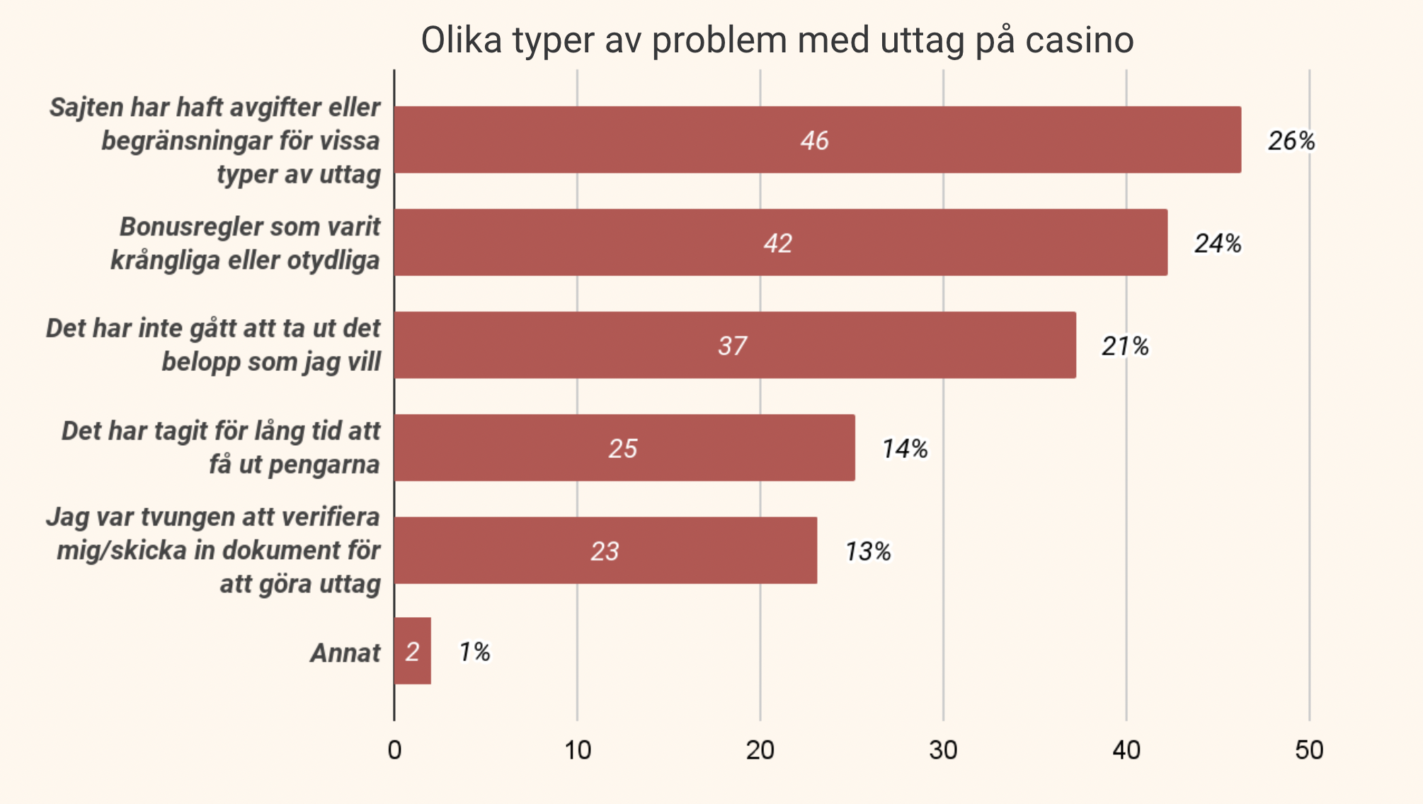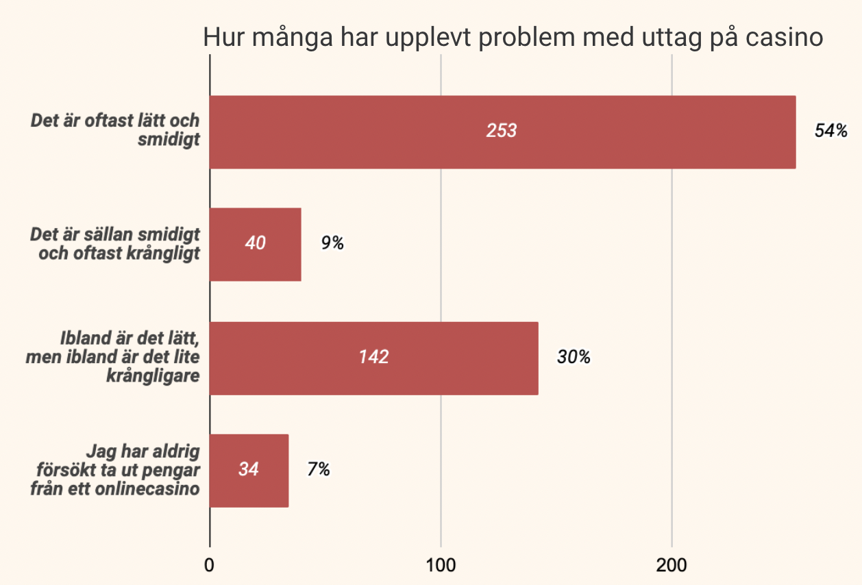 Majoriteten upplever alltså att det oftast är lätt och smidigt, vilket såklart är positivt. Men 42% tycker ändå att mer eller mindre ofta är det krångligt, och sällan smidigt att göra uttag från ett casino.